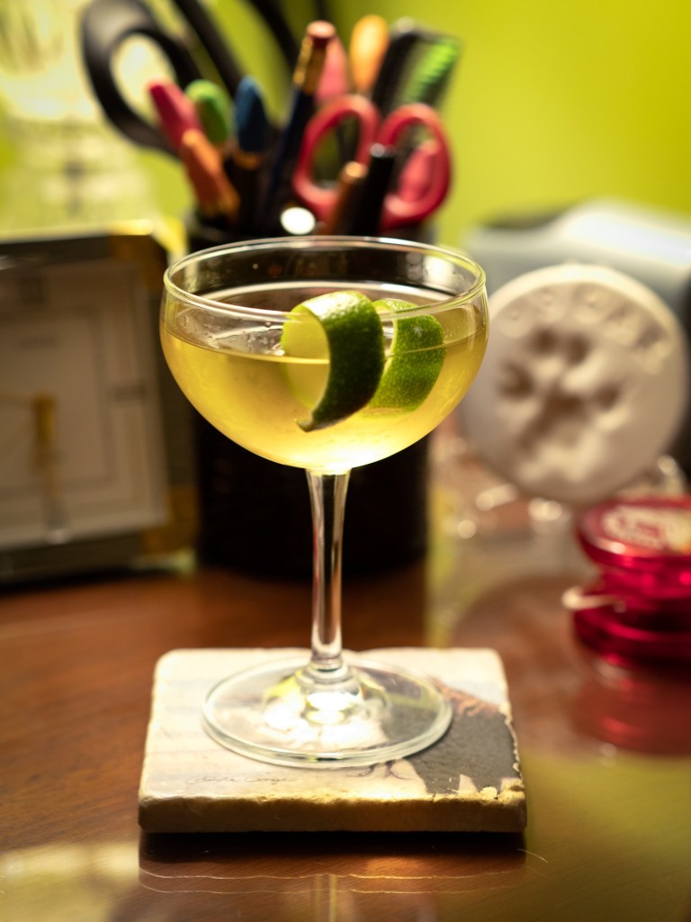 In a mixing glass, stir all ingredients with ice, then strain into a chilled coupe or Martini glass. Garnish with a lime twist.