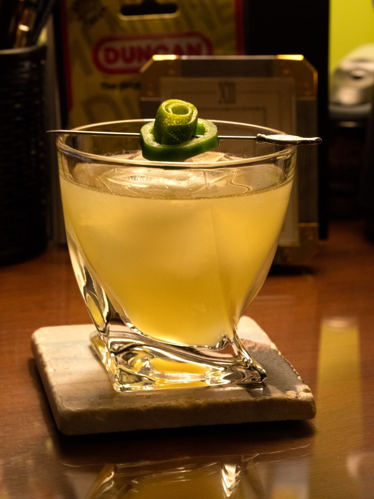 Garnish: Lime twist OR a rosette of a curled lime peel and jalapeño slice. Flame the lime peel, if you dare! That adds a little more smoke on top of the mezcal.
