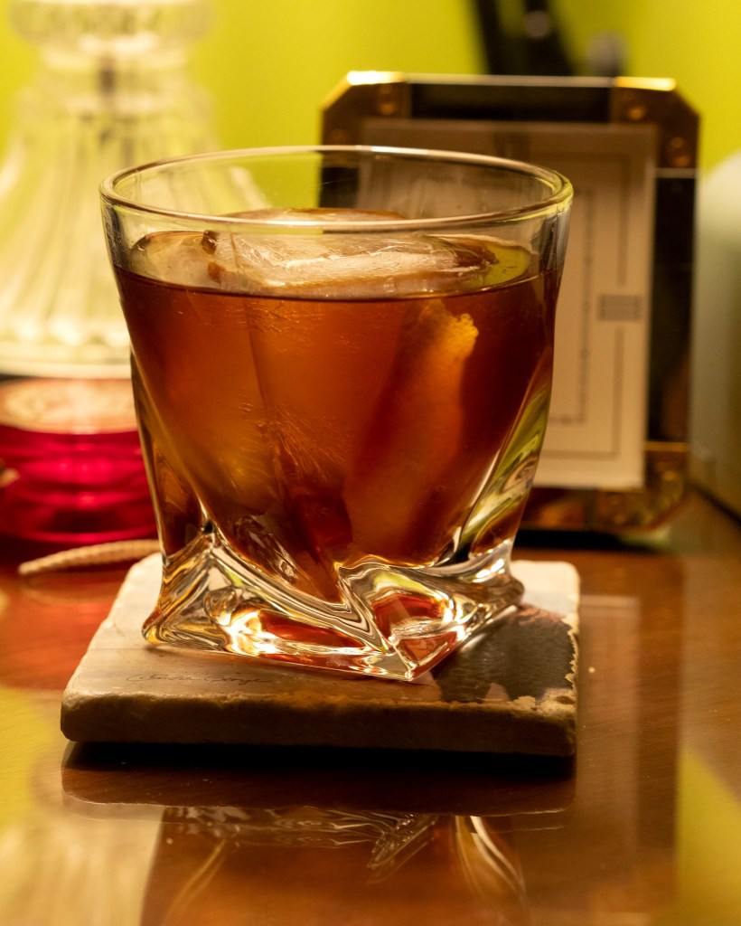 Combine the ingredients in a mixing glass, add plenty of ice, and stir until well chilled. Strain the chilled mix into a rocks or Old Fashioned glass with a big rock, and garnish with a twist of lemon zest.