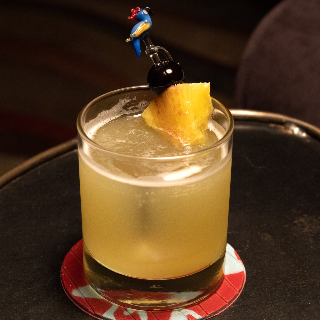 Muddle the pineapple in the base of a shaker. Add the other ingredients, shake with plenty of ice, and fine-strain into an ice-filled glass. Garnish with a wedge of pineapple and a Luxardo Maraschino cherry.