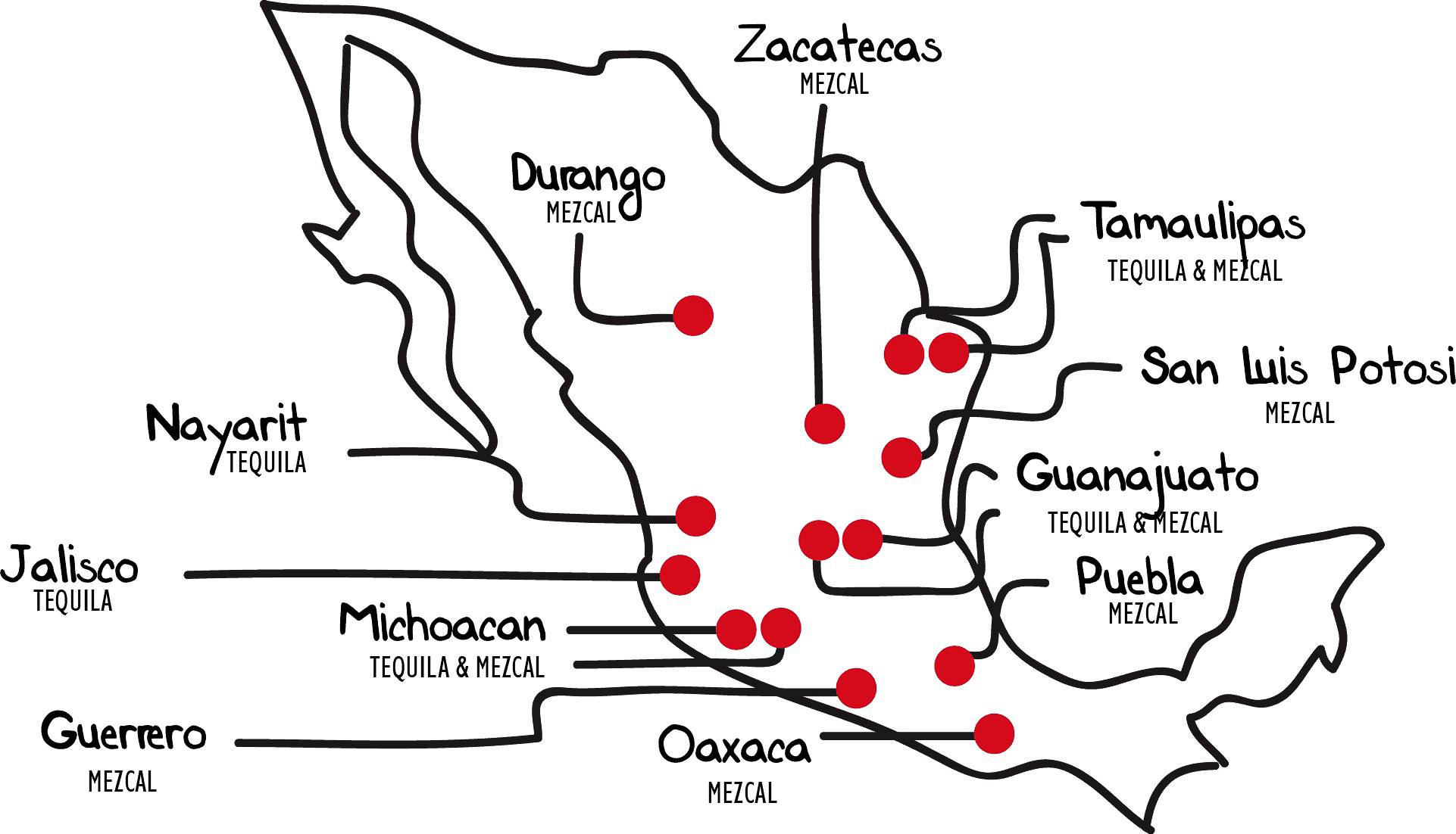 The best way to regard these two categories of agave spirit is that tequila is a very specific type of mezcal. The Mexican regulatory body Norma Obligataria Mexicana (NOM) dictates that tequila may only be made with “blue agave” (Agave tequiliana Weber), while mezcals may be produced from dozens of other specified agave species. Also, the legally defined production zones for tequila are significantly smaller than mezcal’s—portions of only five Mexican states—and the production zones overlap only very slightly. Most tequila is produced in the state of Jalisco (“ha-LEES-ko”), and most mezcal is produced in the state of Oaxaca (“wa-HAH-ka), although there are legal mezcal production zones in eight other states as well.
