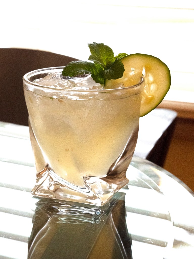 Combine all ingredients in the base of a shaker and muddle lightly to release the oils, aromas, and flavors of the mint and cucumber. Fill the shaker ⅔ full of ice and shake it for 20-25 seconds to chill and integrate the ingredients thoroughly. Fine-strain the mix into a rocks glass filled with fresh ice, and garnish with another cucumber wheel and a sprig of mint.