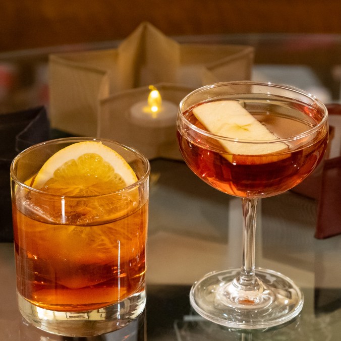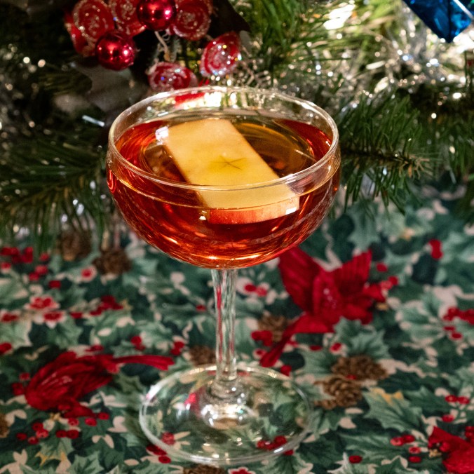 The revered Harry Craddock (all bow!) included this simple recipe in his 1930 Savoy Cocktail Book, calling it “Savoy Tango.” I’m taking literary license to call it “Holiday Tango” because of the sloe gin tradition and because the December holidays are upon us. It adds apple to the dark fruit and spice of sloe gin to make a delightfully fruity but boozy drink perfect for the season.