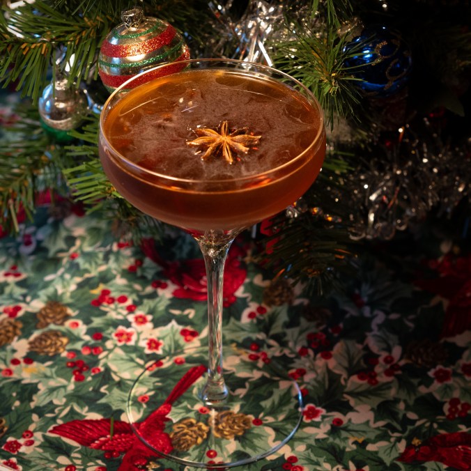 Looking at the recipe, it’s a mulled Black Manhattan. On the palate, it’s like a very boozy mulled wine. However, no heat or maceration is involved in this mulling; the spices are added easily via St. Elizabeth’s Allspice Dram and bitters.